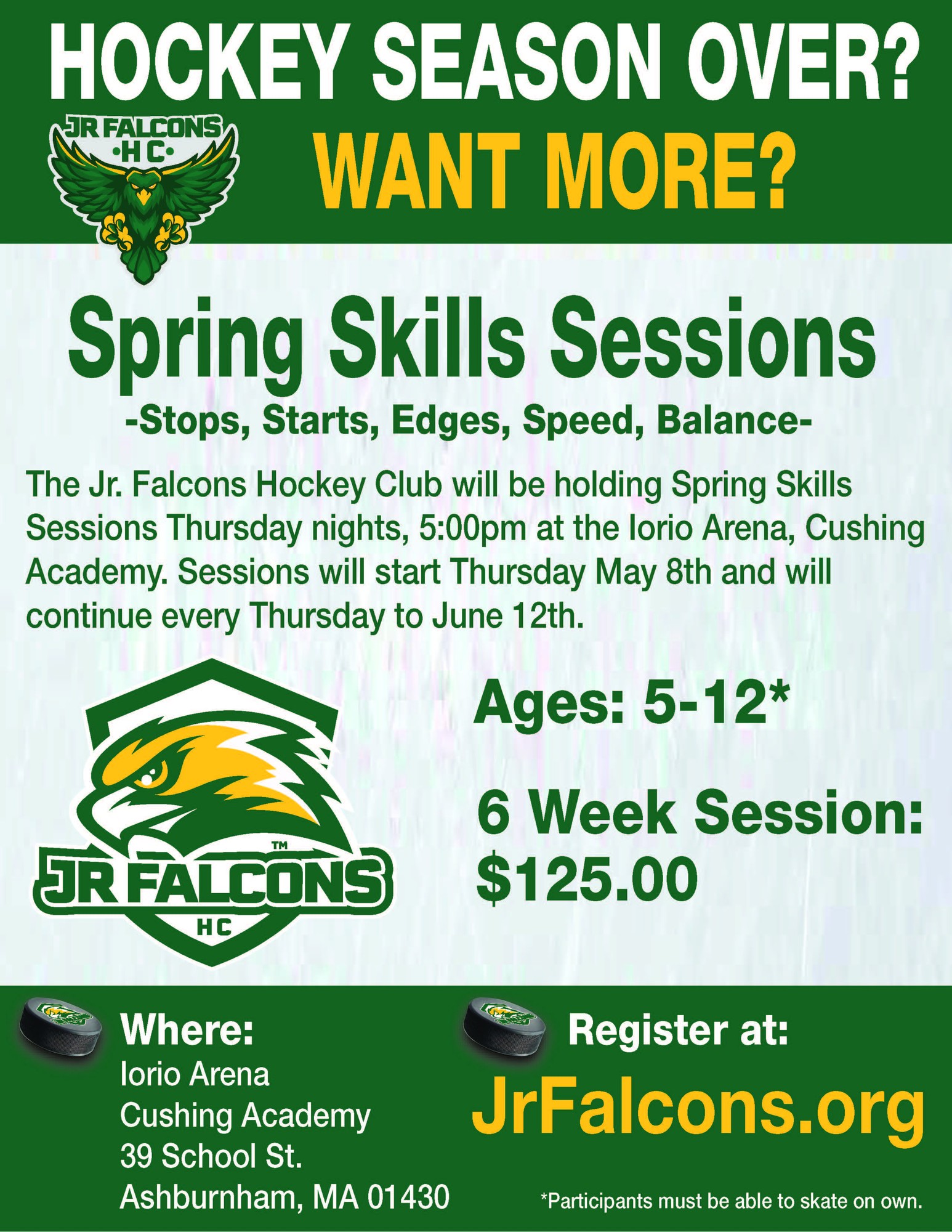 The Jr Falcons are holding a Spring Skills session at the Iorio Arena at Cushing Academy on Thursdays for 6 weeks, May 8 - June 12.